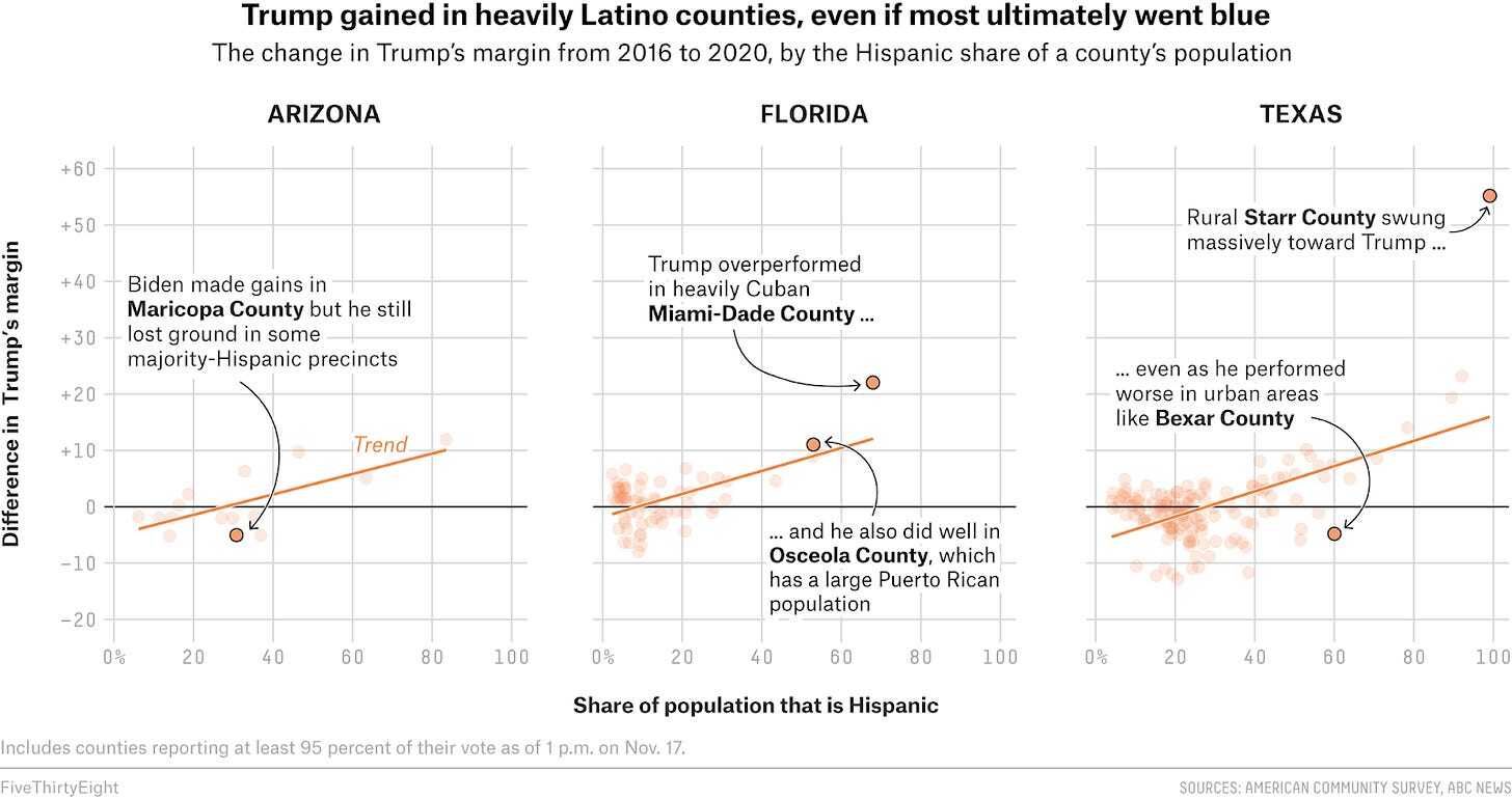 This trio of scatter plots clearly shows how heavily-Latinx counties swung right during the 2020 presidential election.